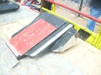 Trax was a box-wedge shaped robot, with a front wedge. It was tracked, as the name suggests, for superior grip and pushing power, and its weapon was a front-hinged flipping arm with a unique rack and pinion system. The statistics board claimed that it was interchangeable with an axe, but this was likely untrue. The flipper was powerful enough to flip robots over, though without the strength required for an out of the arena flip, and the weapon's position on the machine required Trax to be far underneath an opponent to use its weapon, though it would likely prove an effective srimech. Trax boasted a high top speed with its powerful Magmotors, but in return lacked grip on its tracks, and skidded along the arena floor on drives and turns.