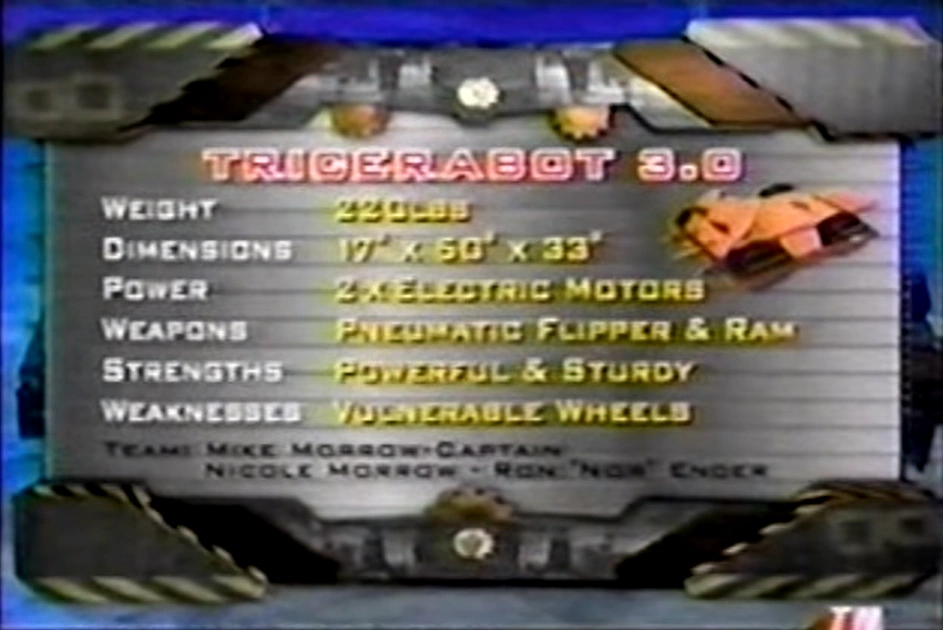 - "TriceraBot, for a moment, had Panzer up on two wheels, which would have been devastating for Panzer, who's not an invertible bot like TriceraBot!"