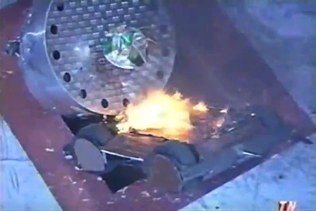 At the start of the battle, the two robots charged straight at each other. This impact caused an airline in the main pressure tank in TriceraBot to come loose, causing the CO2 to leak[29], leaving TriceraBot without a flipper.