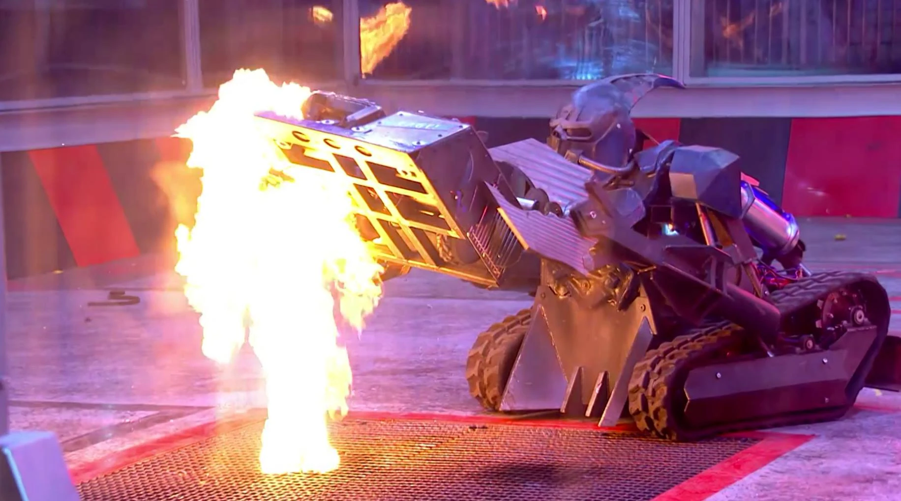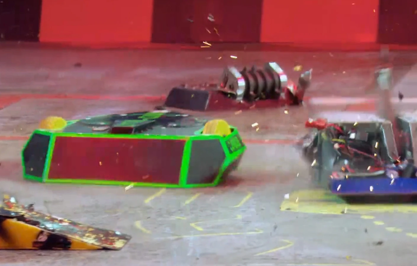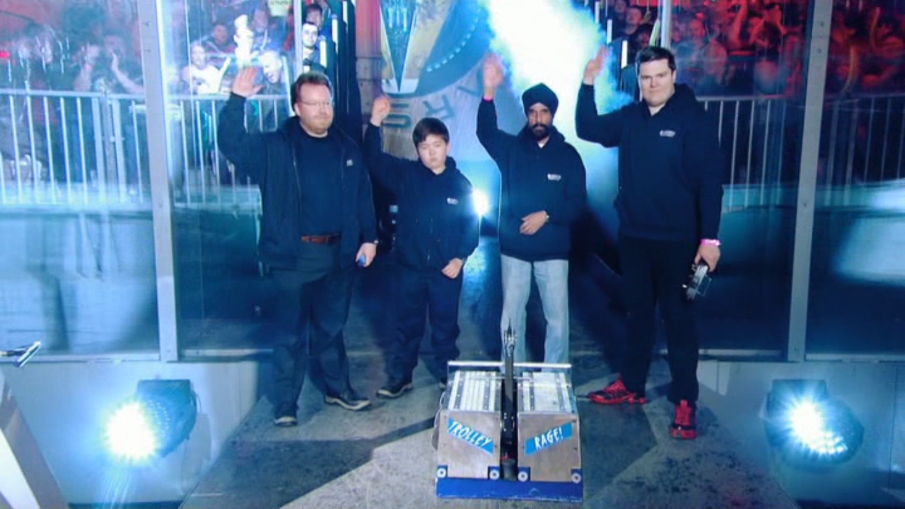 Trolley Rage initially aimed itself towards Meggamouse, but turned to the left after Meggamouse rammed Crackers. Trolley Rage was met with an attack from Carbide, which left its front-right panel dangling loose. Trolley Rage then made its way over Crackers, which was stuck on the Flame Pit, although Trolley Rage failed to connect with an attack of its axe. Trolley Rage then made its way over towards the other competing machines, but was once again met with a critical attack from Carbide, which caused significant bodywork damage as well as ripping out some of the wiring controlling the robot, leaving Trolley Rage immobilised.