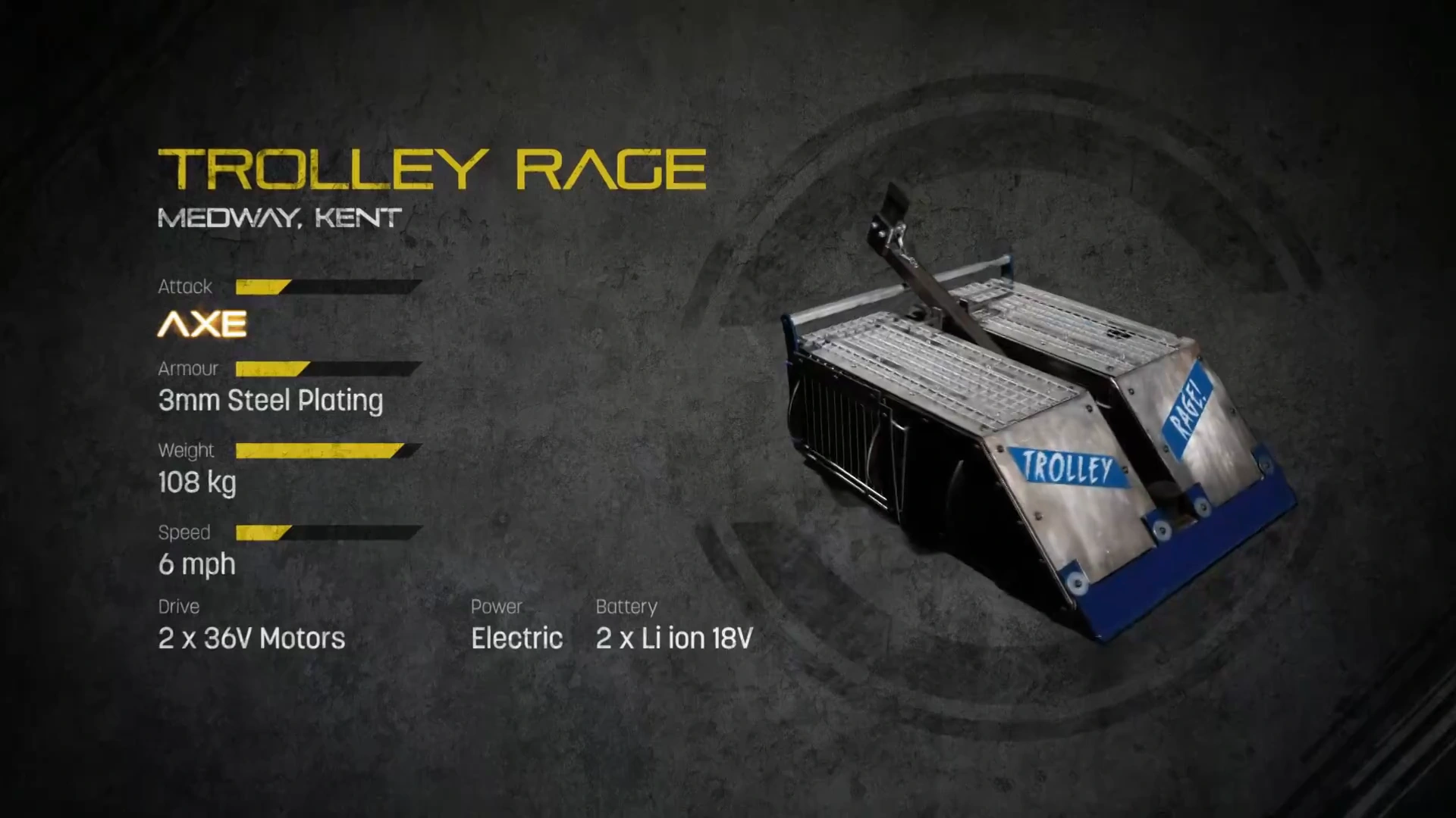 Trolley Rage, apt to its name, was built from an upturned shopping trolley, and armoured in 3mm steel plating, protected by a 40mm thick box-section frame. This made the robot box-wedge shaped in design, and was armed with a bladed axe which rested on the handlebar at the back of the robot, and served as the robot's self-righting mechanism. Trolley Rage was built in a way that required little funding to create, using easily accessible materials such as wheelchair motors, despite featuring other modern internals for safety reasons. Semi-circles were added to Trolley Rage's sides so the robot could not be side-stranded. However, the robot was slow in testing at an estimated 6mph, running on wheelchair motors. To counter this, the motors' voltage was raised before entering the arena, giving the robot a top speed closer to 10mph.