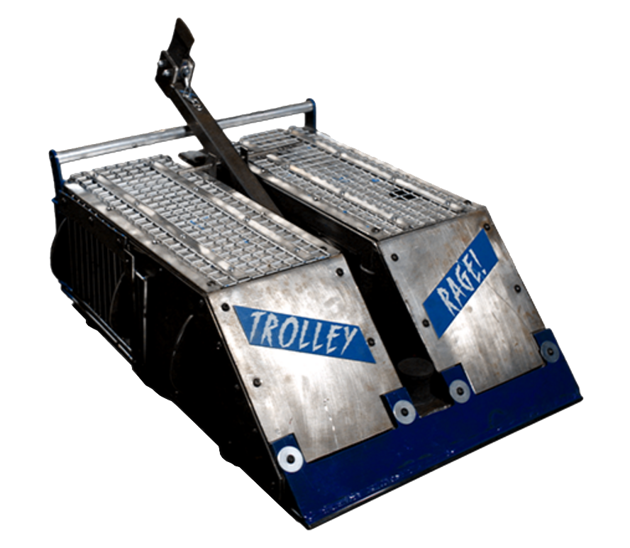 - "Trolley Rage uses recycled components, which helps to keep build costs down. It's constructed from an upturned shopping trolley and its motors were taken from a wheelchair. It also has two interchangeable weapons – mounted spikes or a wedge."