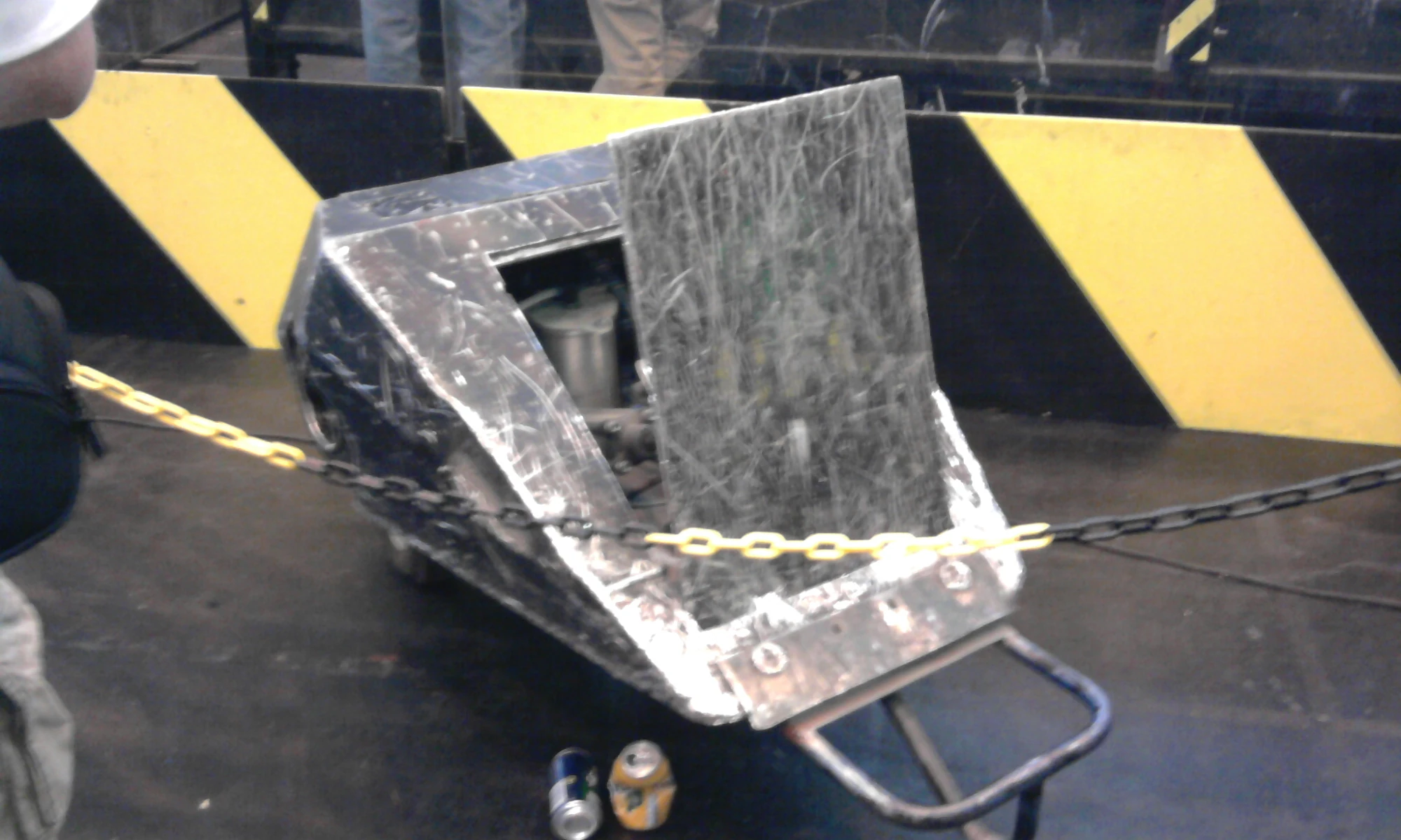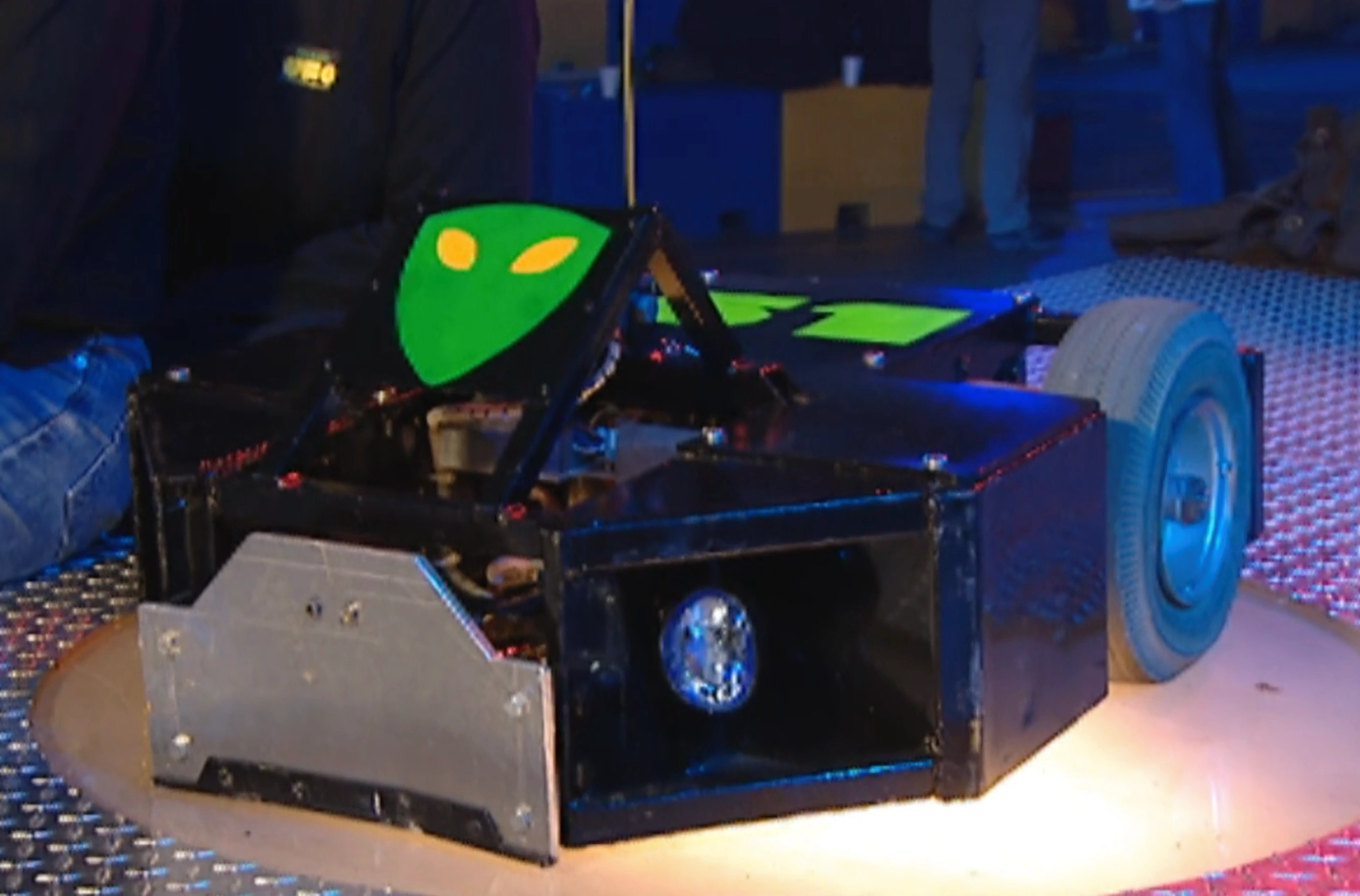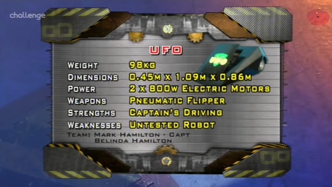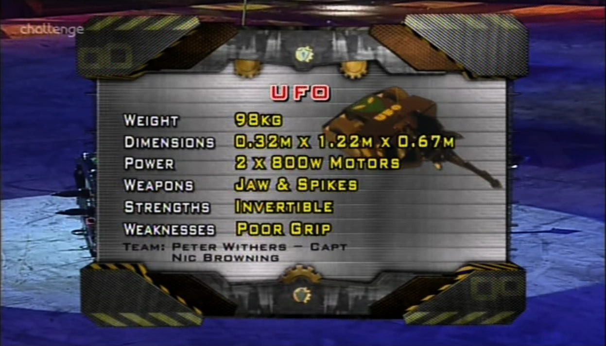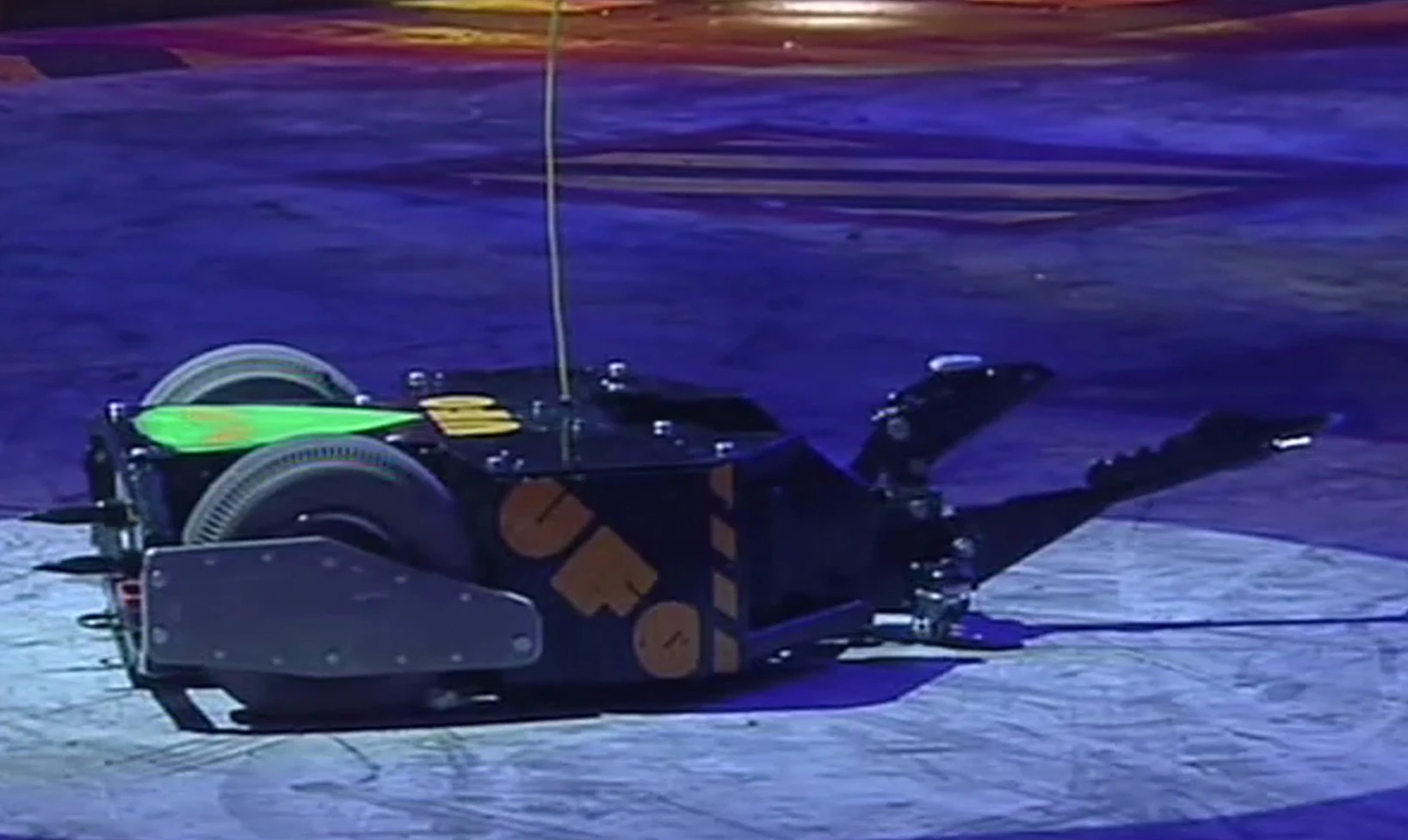 With its flipper failing to work at all, UFO began by attacking Crushtacean, briefly getting underneath it with its wedge as Behemoth came in to attack the pair after flipping Tartarus over in the opening seconds. It drove away as Behemoth turned Crushtacean over, before it pinned Crushtacean against the wall as Behemoth lifted the latter. Again, UFO and Behemoth rammed Crushtacean together a few more times, before UFO wedged under Crushtacean once more, and immediately after, Behemoth lifted Crushtacean against and over the arena wall. UFO finished the battle by getting under Behemoth twice, at one point rolling it over, before being flipped over by Behemoth's scoop. Needless to say, both UFO and Behemoth progressed to the second round anyway.