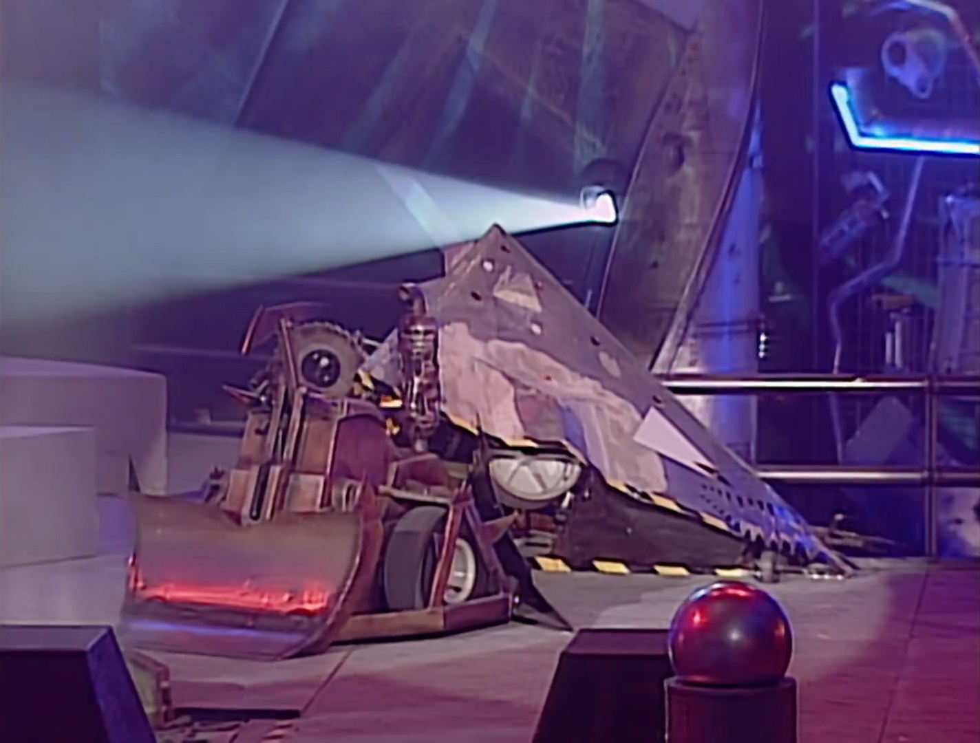 Shunt rammed into Uglybot plough-first, disrupting its escape and getting underneath it while steering Uglybot away from the wall. Eventually, he rammed Uglybot against the corner, and back towards the turntable as it attempted to drive past him, causing part of the turntable to fold over as Uglybot was forced against it. Uglybot only covered 1.65m during its run and was eliminated from the First Wars.