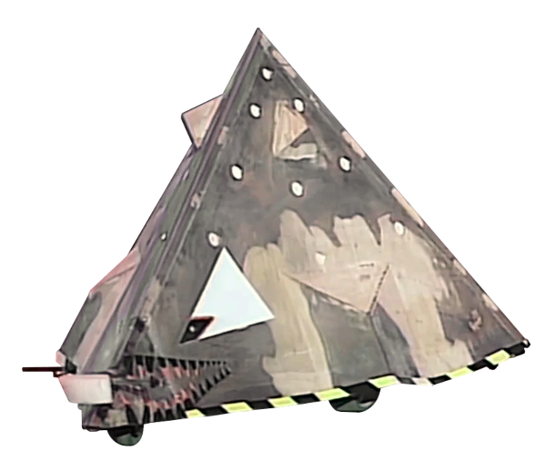 - "With a simple pyramid design to ensure greater stability and maximum defence. Weighs in at 71.9 kilograms, runs off two electric wheelchair motors, and this is clearly a robot to look out for!"