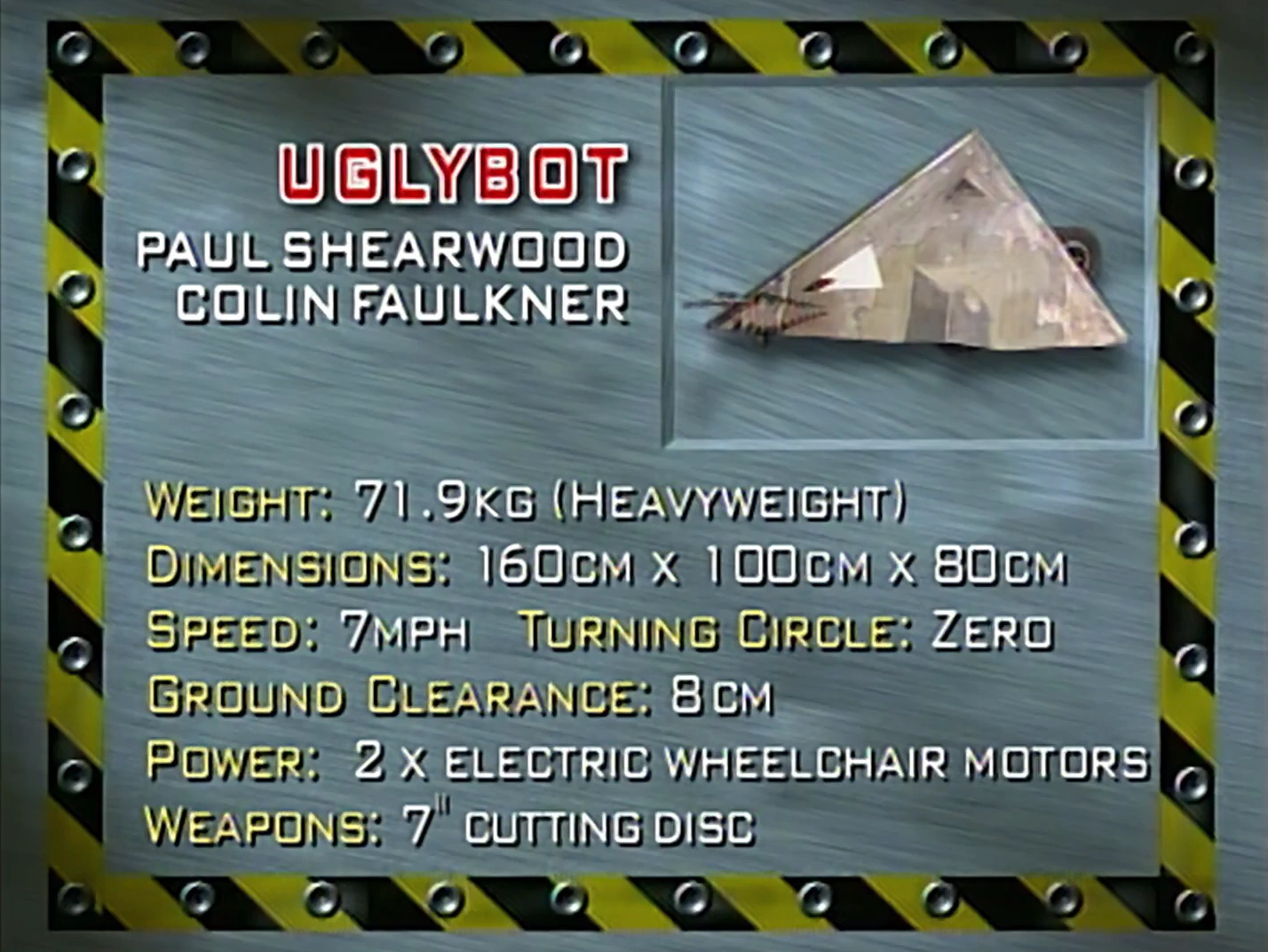 Uglybot was a triangular-based pyramid-shaped robot painted grey with a mouth and eyes added on the front. Its weapons were a pair of 7" cutting discs at the rear and a static cutting blade mounted on the tip of the wedge, while the robot also featured a flashing amber warning light inside its shell as a 'gimmick'. However, neither Uglybot's weapons nor the warning light were seen in action, as it was eliminated at the Gauntlet stage.