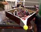 1996 US Championship | A large featherweight walkerbot, Roach was equipped with side frames and panels which could drop down on opponents using a winch system. The panels themselves were covered with sheets of blue tarpaulin, intended to act as entanglement devices similar to the 1994-1996 mousetrap hazards.[18][19] | The robot's dimensions guaranteed a large attack area from either side. | Effectiveness of these devices was never properly demonstrated, as Roach itself suffered recurring mobility and radio interference issues in each of its battles. Tarpaulin sheets were fragile and mostly removed ahead of its Featherweight Melee battle. |