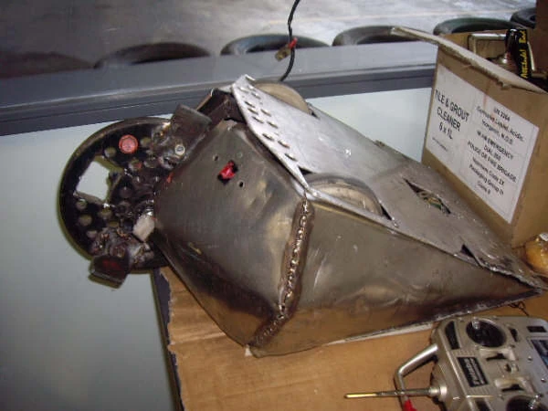 Vertex was a tall rounded box shaped robot with a wedge on the back. The robot had six wheels powered by a pair of 24V Briggs & Stratton starter motors, which could produce between 8-12 horsepower, with four larger wheels protected inside of the chassis and another set of two smaller wheels on the back wedge of the robot to help it drive inverted. Vertex was armed with 20kg vertical flywheel from a car powered by a 20cc McCullogh Chainsaw engine, also featuring a pneumatic self-righting arm on the top of the robot. Vertex's chassis consisted of welded 25mm Mild Steel box-secction covered in 3mm for armour, however, this armour was only intended to be temporary. In addition to the two 15ah SLA batteries, Vertex featured a 40-amp alternator from a car which was powered by a chainsaw engine which served as a battery backup charger to ensure that it could run for a full fight without losing power. Minus the speed controllers and radio equipment, the entire robot cost around $1900 to build, with some of the parts being donated.