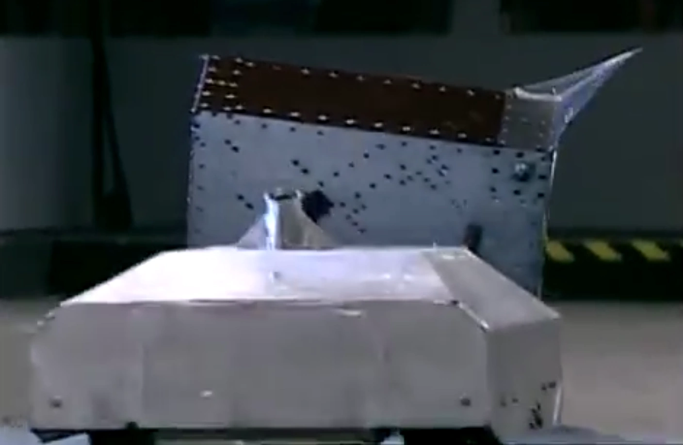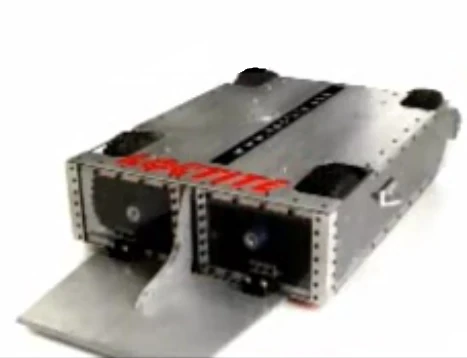 Vlad the Impaler's construction primarily consisted of a welded steel chassis and an welded aluminum shell, the latter characterized by a boxy shape with angled sides near the top. The chassis and unpainted shell were each connected through a set of rubber 'bumpers' functioning as shock mounts, contributing to the robot's outstanding durability against heavy impacts. Another measure to maximize reliability was the installation of a heat sink, attached to the Vantec speed controller, to manage the current drawn through its powerful drivetrain.[3][4]