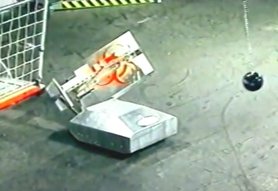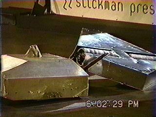 While the slower of the two robots to start, Vlad the Impaler soon turned into and began ramming Richard Brull's machine. The second ram appeared to compromise Prometheus' mobility, as its right wheel began locking up frequently. Vlad the Impaler shoved Prometheus into the lower wall, between the mousetrap and lower-right flipper, following this attack up with another series of rams. These rams were eventually sufficient to immobilize Prometheus in the corner, awarding Vlad the Impaler its first career victory.[13]