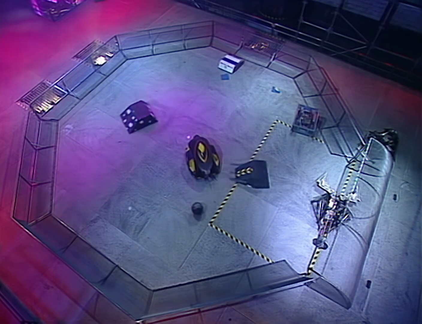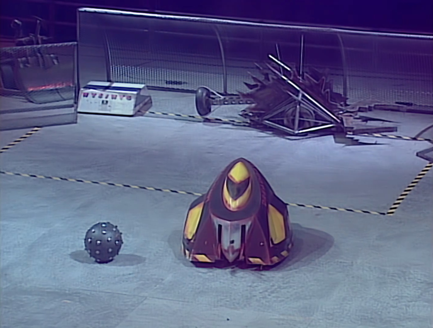 The game restarted, and Cruella blocked WYSIWYG as they both moved around the immobile Dreadnaut. Cruella pushed the ball into Dreadnaut, then pushed the ball onto the curved wall, and after a few attempts freed the ball into open play. Meanwhile, WYSIWYG attacked Dead Metal and was knocked into the goal post, and Cruella eventually scored the next goal.