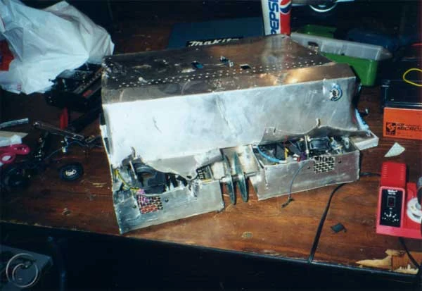Aluminum sheet materials would be used for both Webster's chassis and armor panels, a design choice made purely out of 'weight considerations'. To provide adequate cooling for the Novak controllers, 'several' holes were cut into the top panels, with pieces of 'wire mesh' inserted beneath as protection.[1][3]
