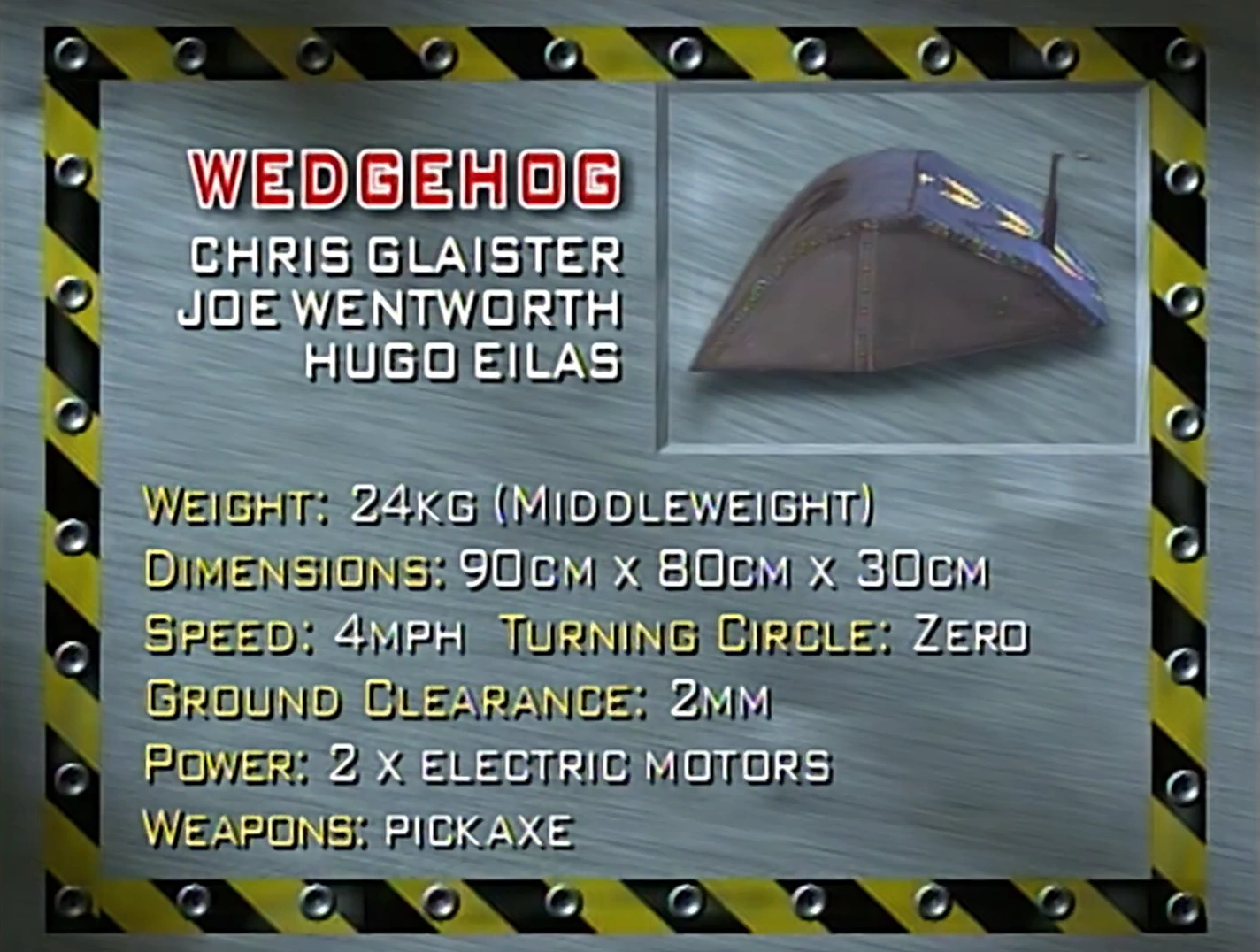 - "Featuring a deadly pickaxe! This middleweight entry clocks a top speed of four miles an hour. Wedgehog runs off two 9.6 volt domestic electric drills, and weighs in at a power-packed 24 kilograms!"
