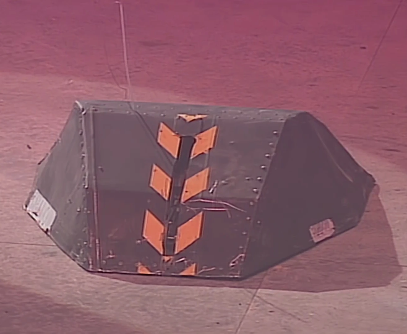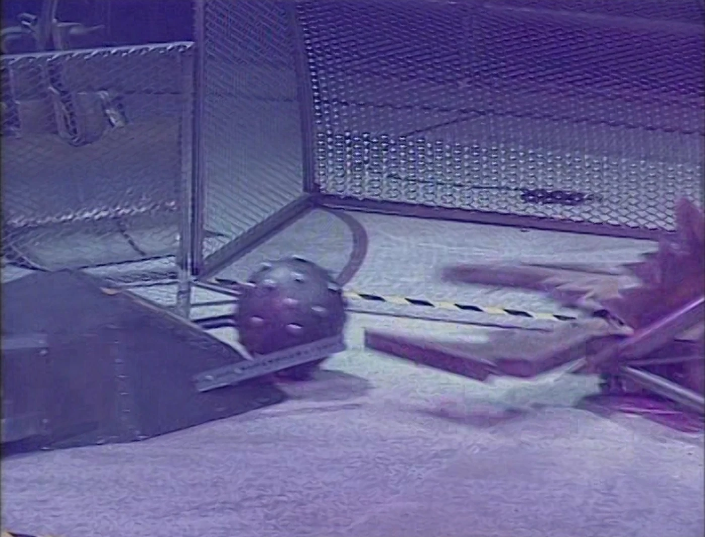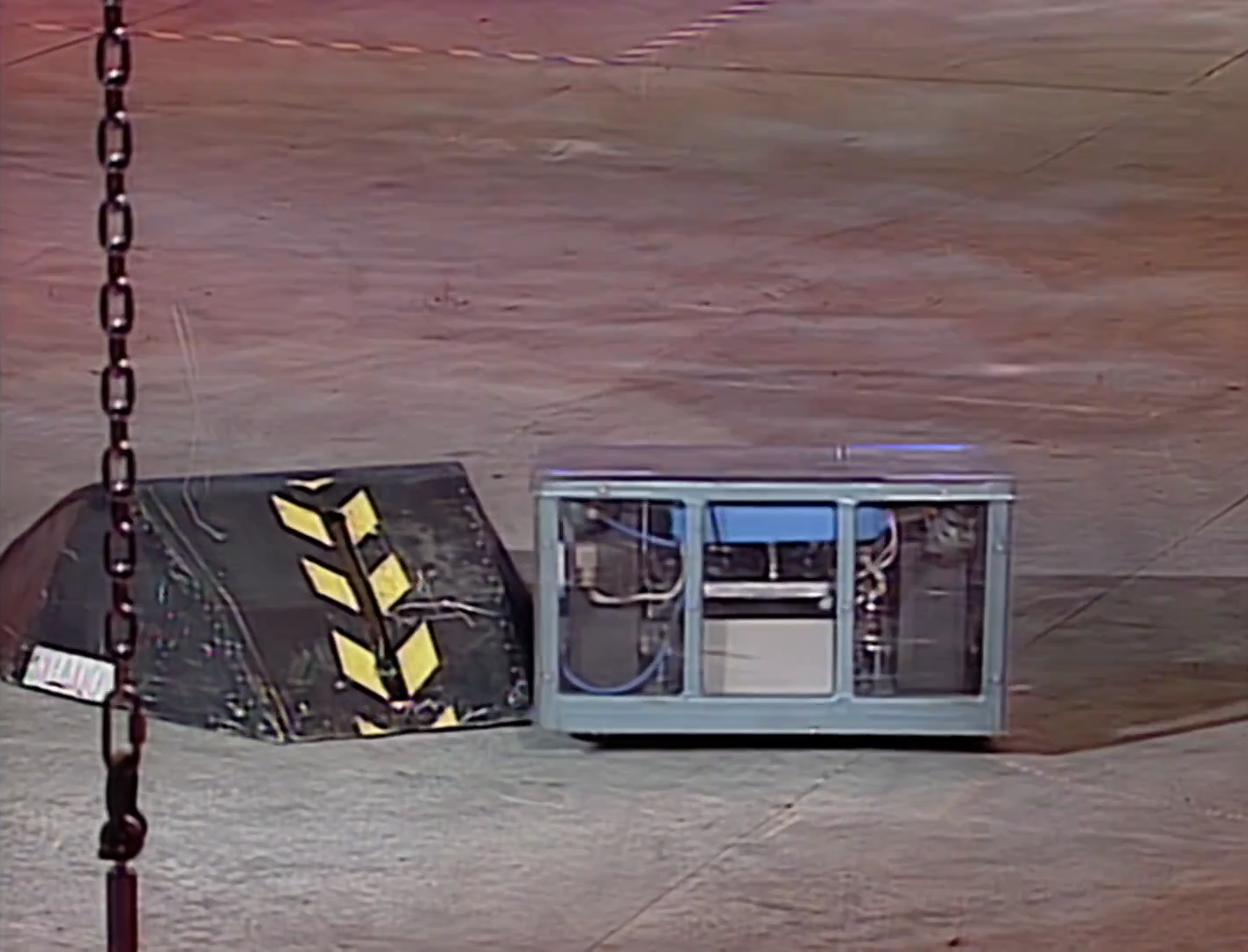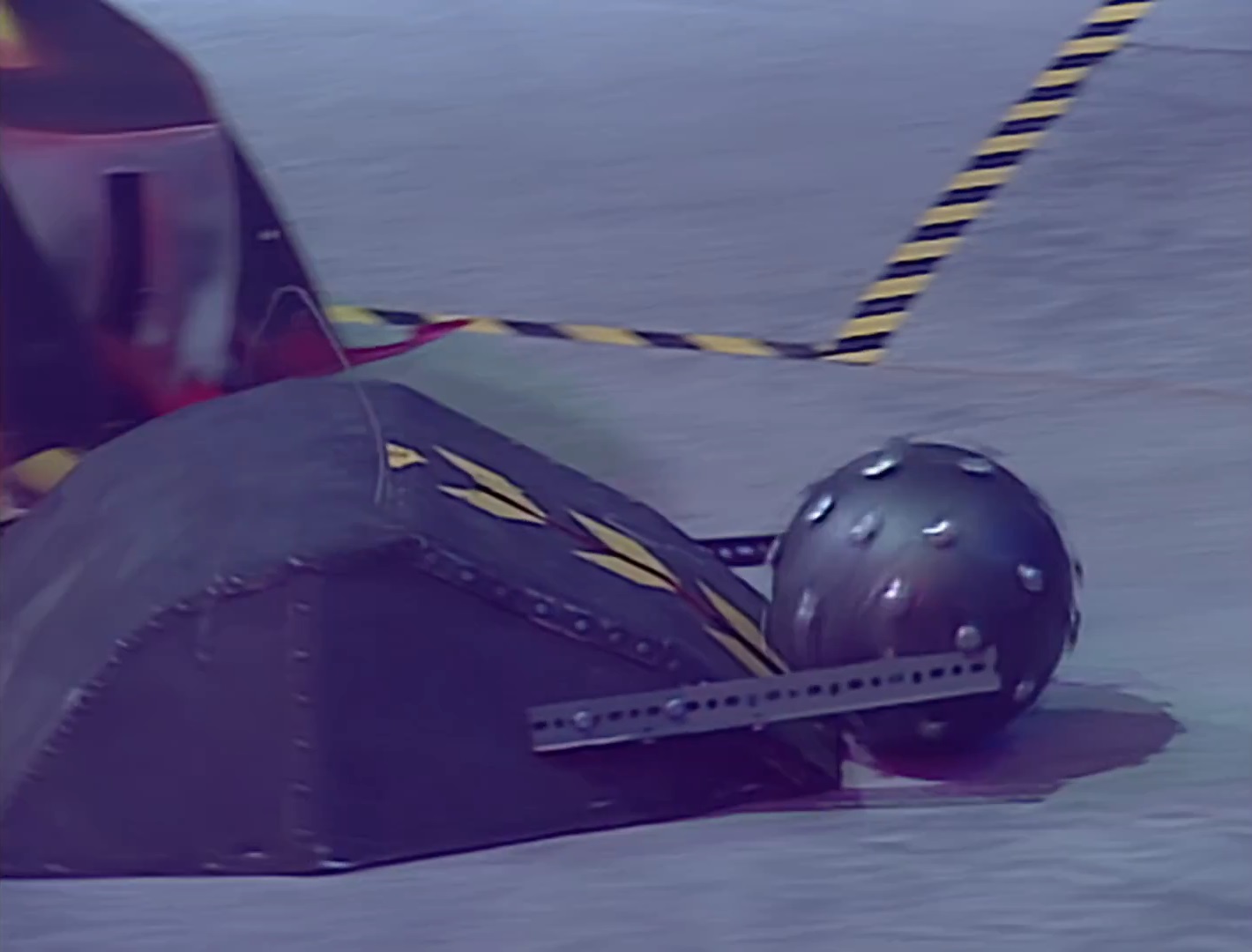 Wedgehog drove around the ball, but when it turned, it knocked the ball aside instead of getting it between the panels. The ball rolled to Robot the Bruce, which pushed the ball to Wedgehog, then pushed past Wedgehog, rolling the ball onto the side walls. The ball rolled back, and because Dead Metal was off his line, this left a clear path for Robot the Bruce to push the ball in for the first goal.