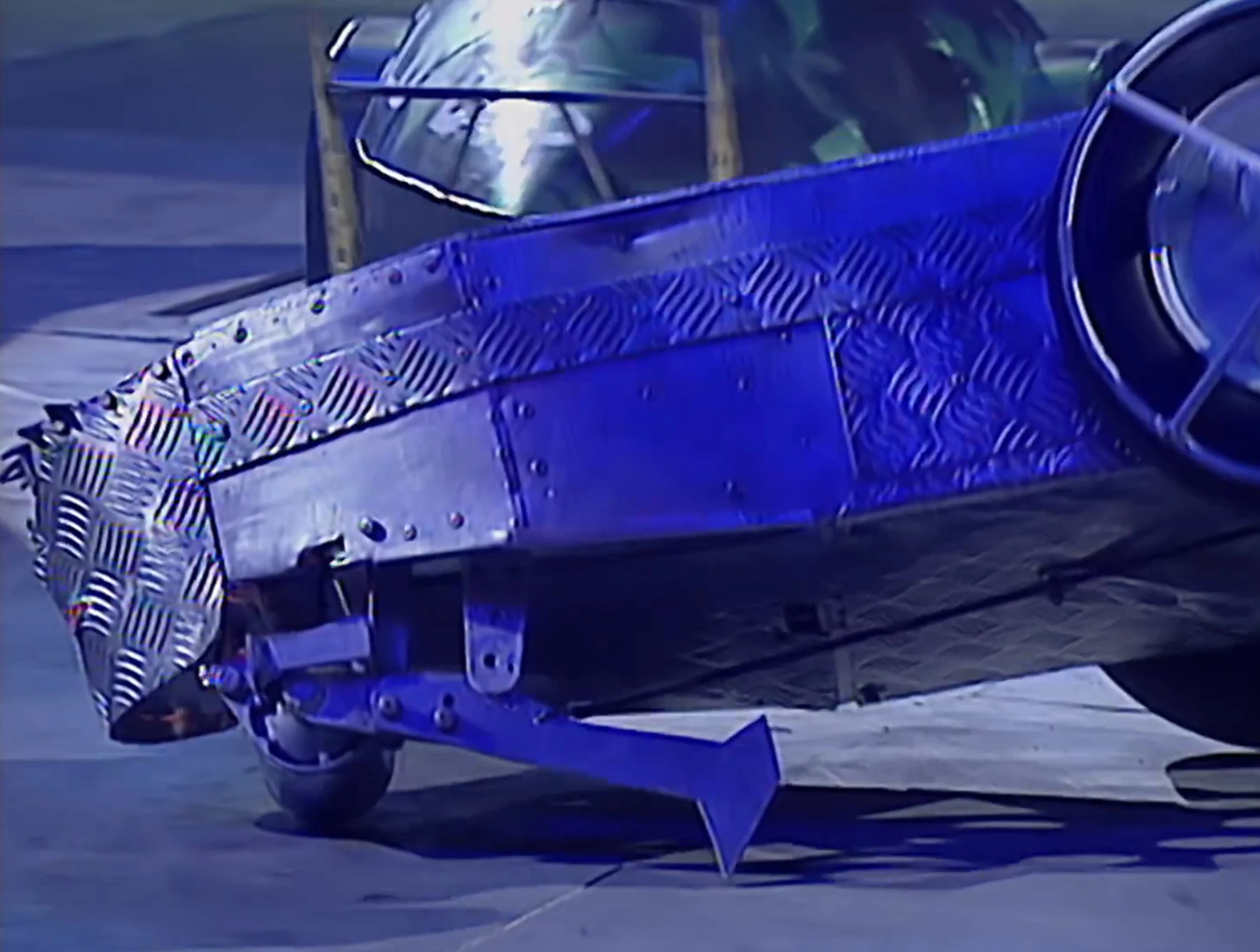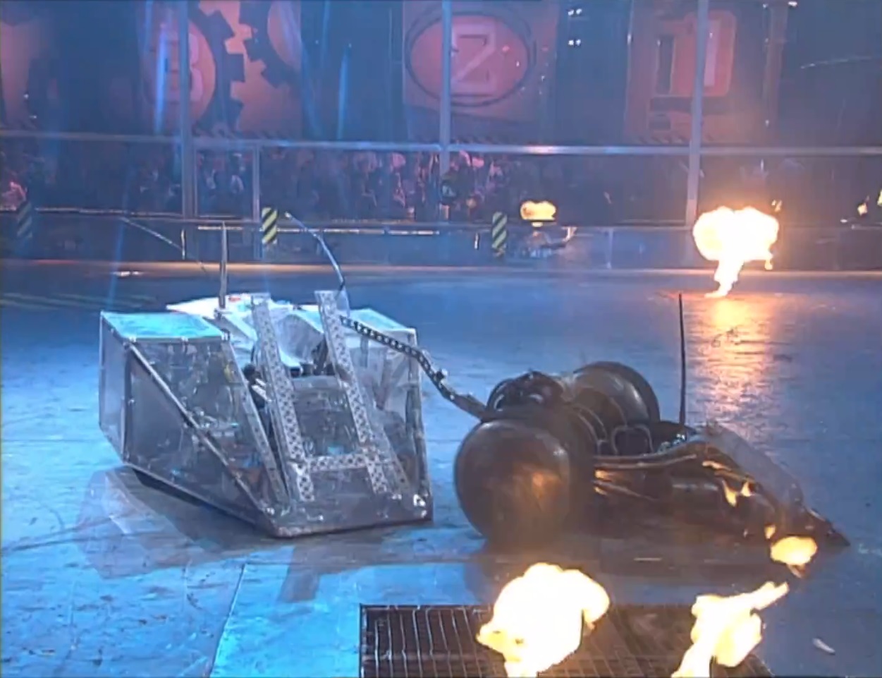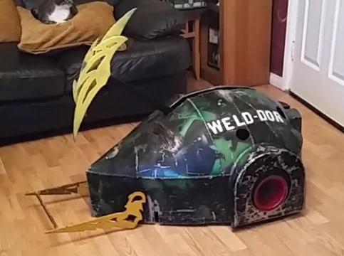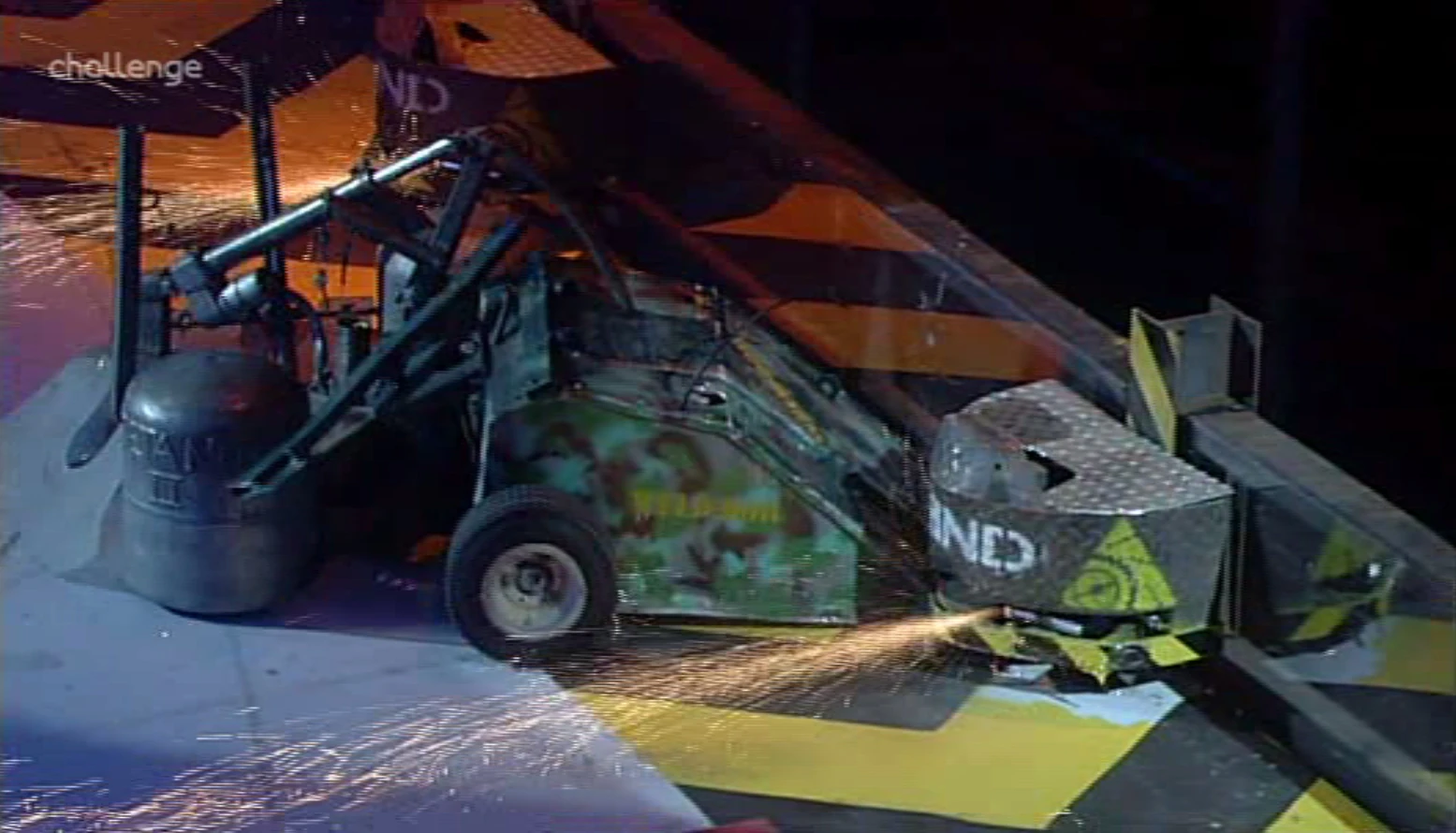 In the battle, Weld-Dor 3 was immediately chased after by Firestorm 4, and despite driving away, then turning to fight, Firestorm 4 got straight under Weld-Dor 3 and flipped it over. Weld-Dor 3 self-righted spectacularly immediately, but was it by Corkscrew as it landed, before being flipped over again by the English machine. As it went over, Corkscrew slammed into it, which caused its own rear blade to get in the way. An untelevised attack from Corkscrew then shattered into the wheel of Weld-Dor 3, twisting its chassis and causing the robot's CO2 to vent out of the machine, preventing it from being able to self-right[3]. A failed attempt to self-right caused Weld-Dor 3 to land on its side, having been blocked by its spinning blade, and Bondi Titch.