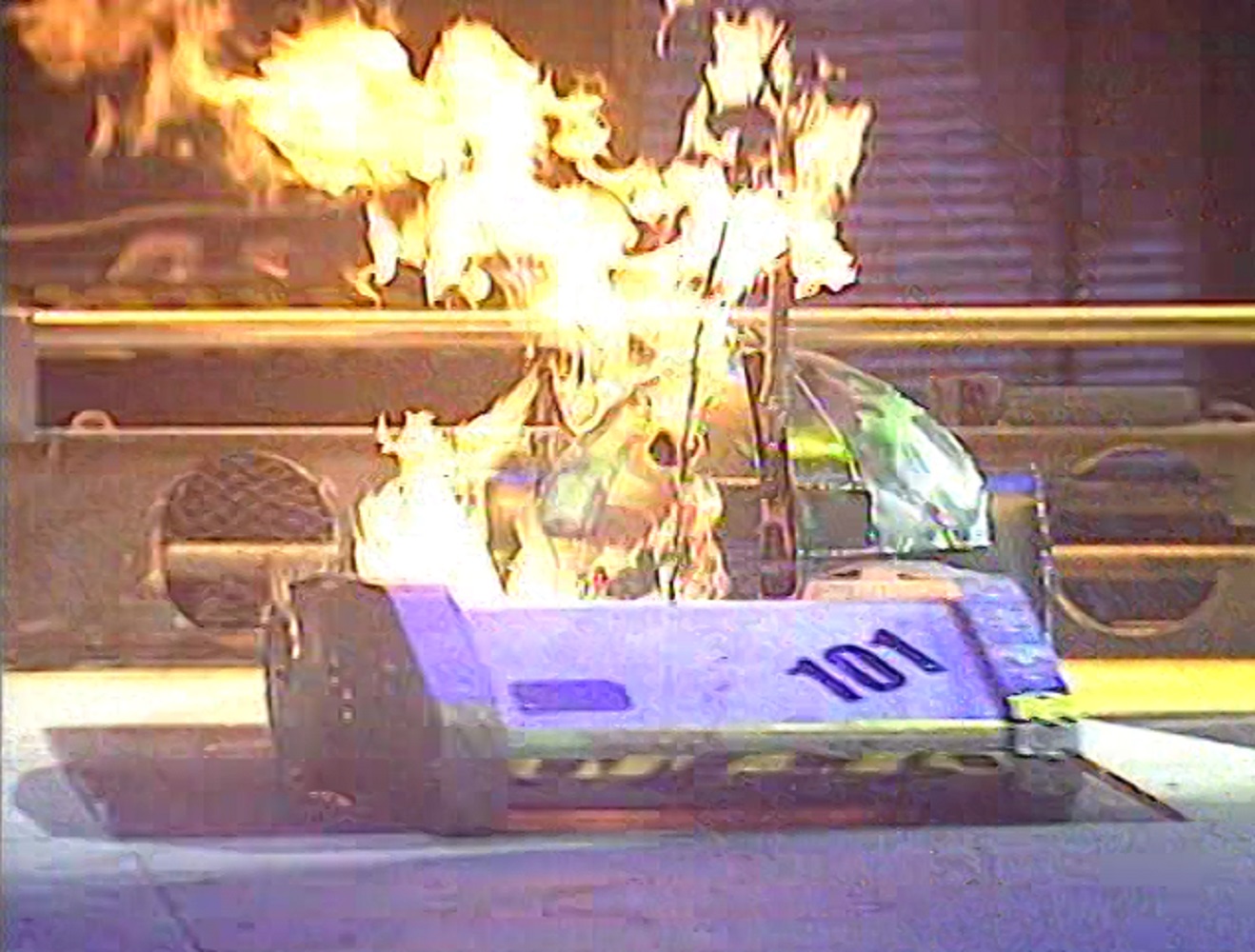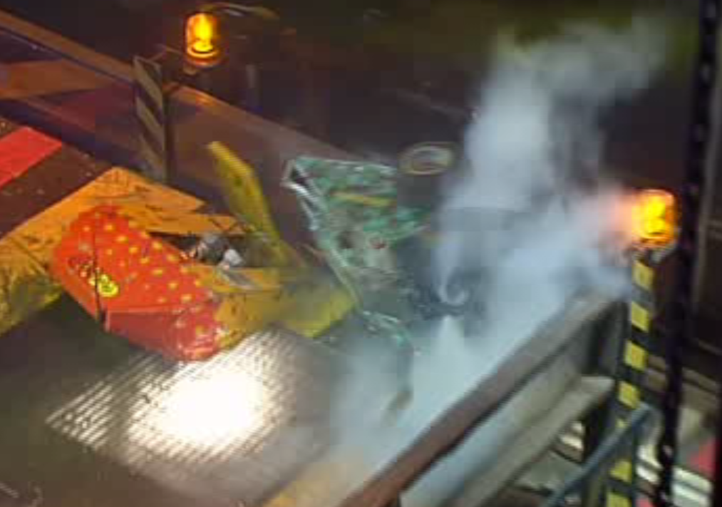 101 reversed, then got behind Weld-Dor, and pushed it towards the Pit, but Weld-Dor turned away in time. Weld-Dor continued firing the axe as 101 pushed it, but it still failed to do any damage. However, 101 was still in position to push, so rammed Weld-Dor onto the Flame Pit. Weld-Dor got away from the Flame Pit, and 101 started pushing at its front. Weld-Dor lifted 101 up, and 101 drove up Weld-Dor's side, then reversed off. 101 got behind Weld-Dor again, and pushed it into the arena side wall. Weld-Dor's axe was still unable to do any damage, despite landing multiple blows on 101. Weld-Dor turned away from the wall as 101 reversed for another charge, only for 101 to push it back into the wall, pinning it there. 101 drove away, and Weld-Dor drove after it, getting its forks under it, but 101 drove over them as time ran out.