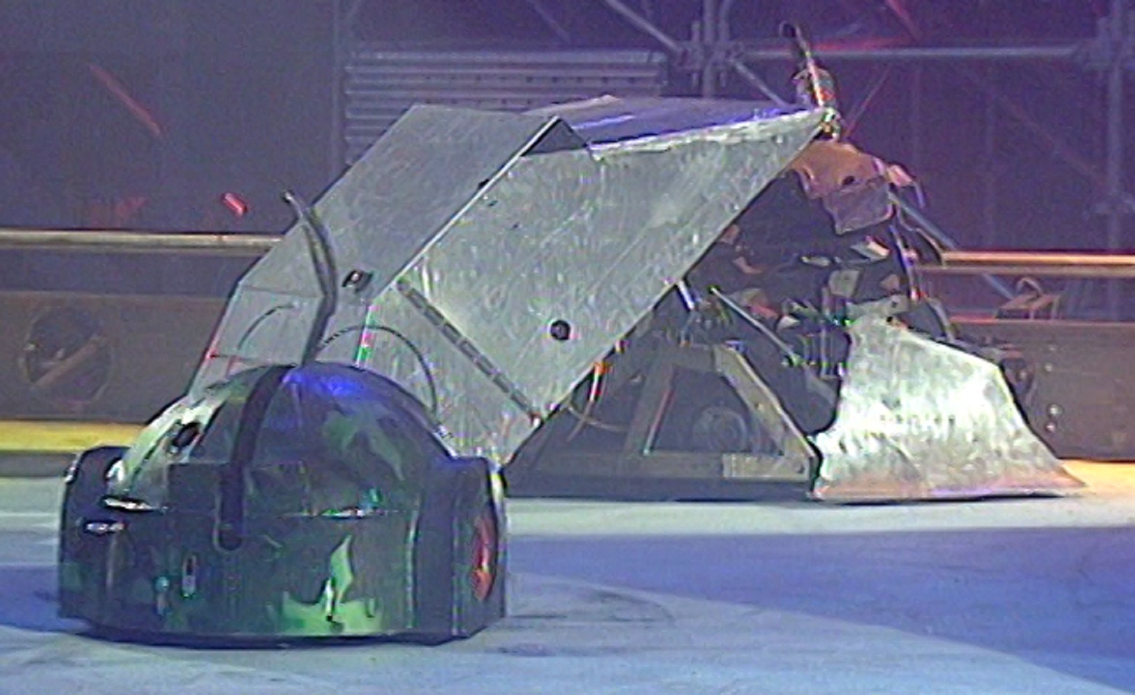 Weld-Dor drove up the arena, and 101 reversed into it, pushing it into the arena wall. Weld-Dor struggled to get away from the wall, and 101 pushed it into Sgt. Bash's CPZ, but Weld-Dor managed to turn away and escape before the House Robot could attack. As the two robots faced each other, Weld-Dor got at 101's side and hooked one of its forks on one of 101's tracks. However, 101 had one track touching the floor, and managed to pull back against Weld-Dor. Weld-Dor pushed 101 into the arena wall, and 101 slipped off the lifting fork. 101 tried to get behind Weld-Dor, but Weld-Dor turned so it was side-on against 101, and fired the axe, but this caused no damage.