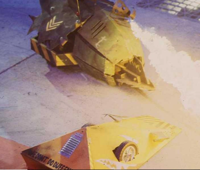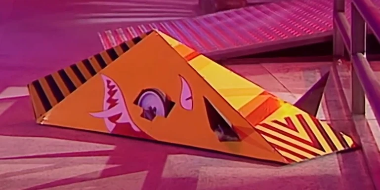 Wharthog was a yellow, triangular wedge-shaped robot powered by an electric 24W wheelchair control unit. Its weapons were a pair of angled spikes designed to resemble the tusks of a warthog, which in tandem with its front wedge served as the robot's primary means of attack. The robot took just over eight weeks to build[1]. While the robot had reasonable speed and a low ground clearance, Wharthog suffered from a large turning circle of two metres, which contributed towards its early elimination in Series 1.