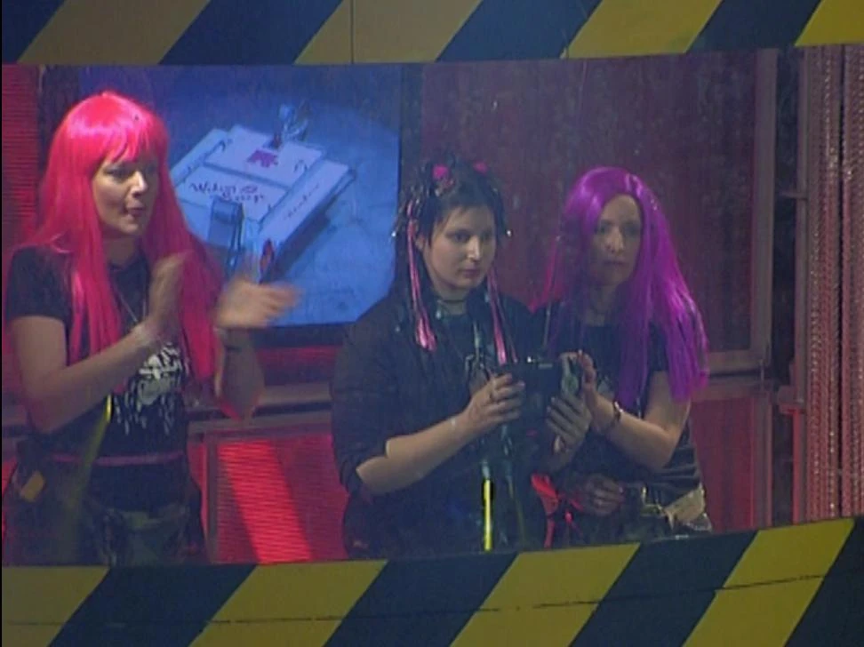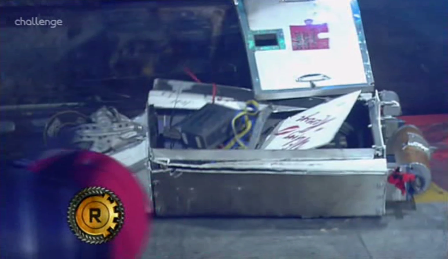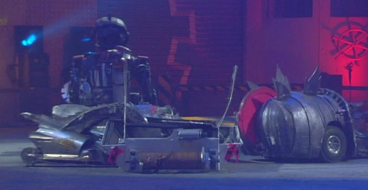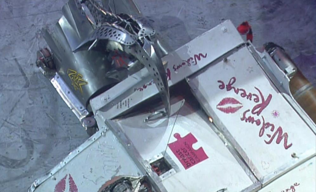 As Widow's Revenge was pushed towards the Floor Flipper, the Robot Widows held their disparaging banners up in their control booth. Refbot counted out Widow's Revenge there, before Razer drove in to cause even more damage after the team's partners had already lost. Razer crumpled Widow's Revenge off the floor again, and then the House Robots closed in, with Matilda using her flywheel to throw the beaten robot up, removing its top armour completely.
