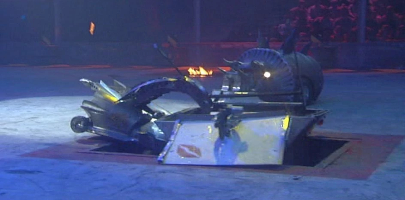 The clash between boyfriends and girlfriends started in the arena, and Widow's Revenge now sported small pieces of Diotoir fur on its back end. However, Widow's Revenge was unable to position its weapon in a way that it could hit Razer, and the hydraulic crusher forced its way down, causing a strip of metal to fly off, while the top armour of Widow's Revenge was crumpled. Widow's Revenge was forced from the floor as it was pierced, and another attack from Razer caused more strips of metal to fly away, and Widow's Revenge's other top panel was crushed. Widow's Revenge had already been immobilised, so Razer pressed the Pit release button and then inflicted more damage, placing Widow's Revenge over the Flame Pit.
